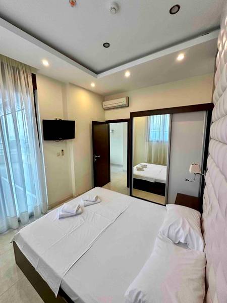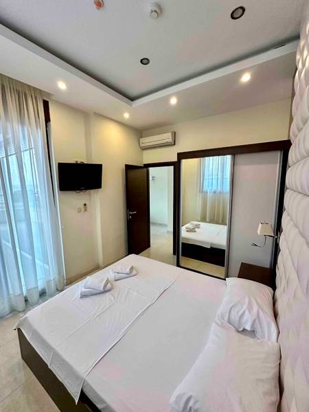 Spavaća soba: Francuski ležaj, garderober/ormar sa ogledalom, toaletni sto, tabure, smart TV od 32 inča, sef, električna roletna