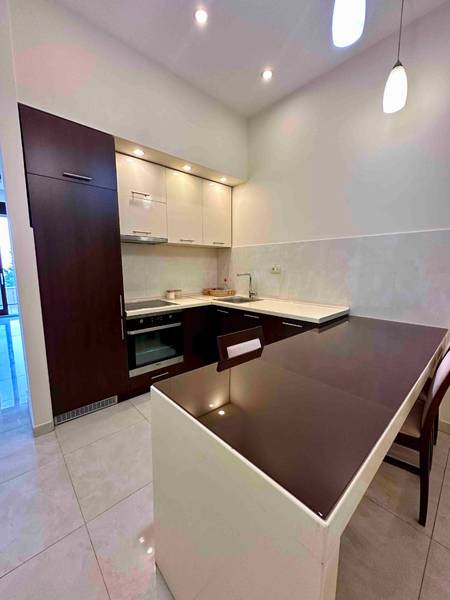Kuhinja: šank, barske stolice, šporet sa ravnom pločom, pećnicom i respiratorom, frižider, mašina za suđe