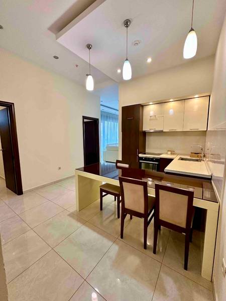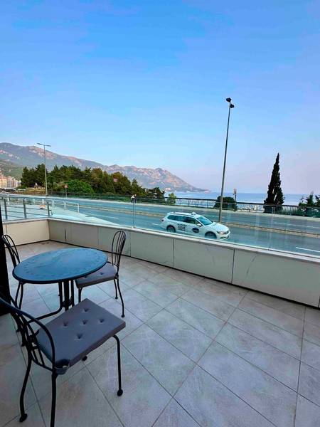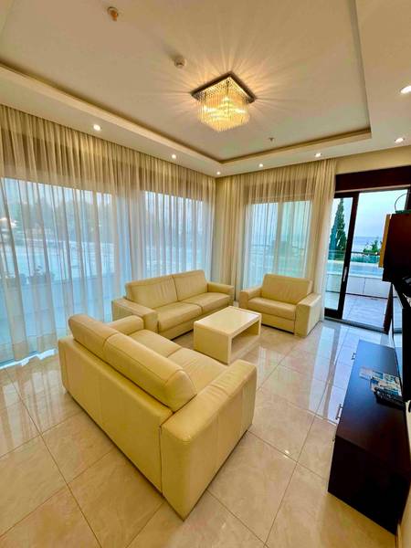 Dnevni boravak: kožna garnitura - fotelja, dvosjed, trosjed (rasklapanjem se dobija francuski ležaj dimenzija 160x200), klub sto, smart TV, kablovski TV kanali, bežični telefon, podno grijanje, električne roletne, terasa opremljena sa garniturom za sjedenje