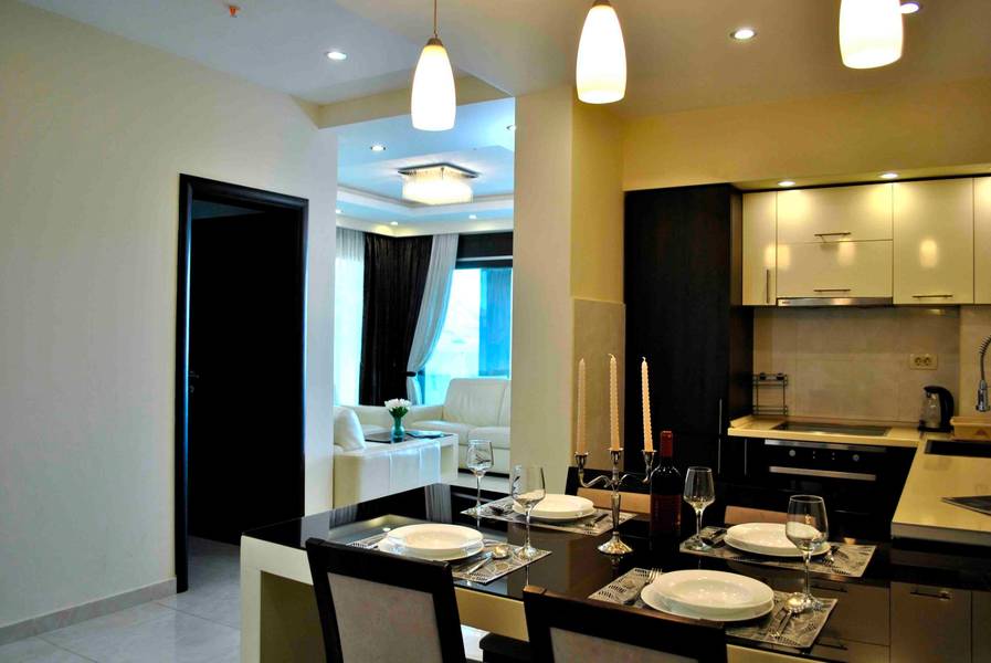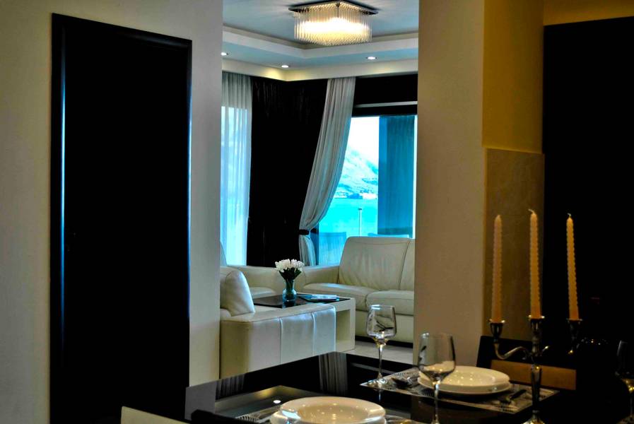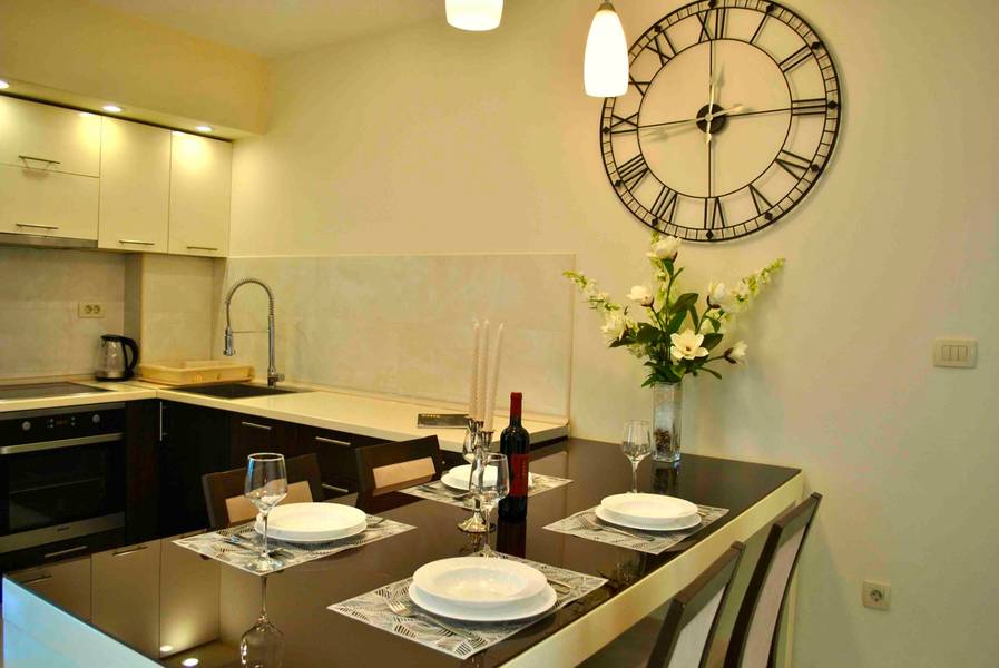 Dnevni boravak: Kožna garnitura - fotelja, dvosjed, trosjed (rasklapanjem se dobija francuski ležaj dimenzija 160x200), klub sto, smart TV, kablovski TV kanali, bežicni telefon, podno grijanje, električne roletne, terasa opremljena sa garniturom za sjedenje