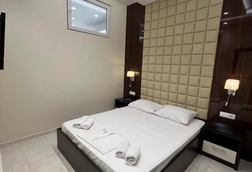 Spavaća soba: Francuski ležaj, garderober/orman sa ogledalom, toaletni sto, tabure, smart TV od 32 inča, sef, električna roletna
